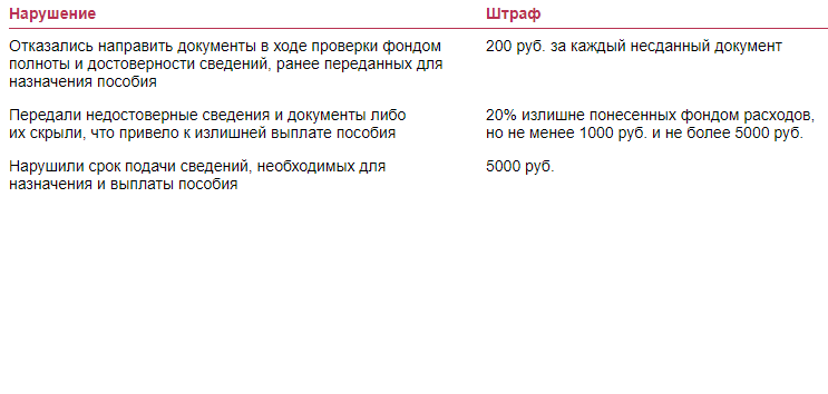 | Отказались направить документы в ходе проверки фондом полноты и достоверности сведений, ранее переданных для назначения пособия | 200 руб. за каждый несданный документ |
