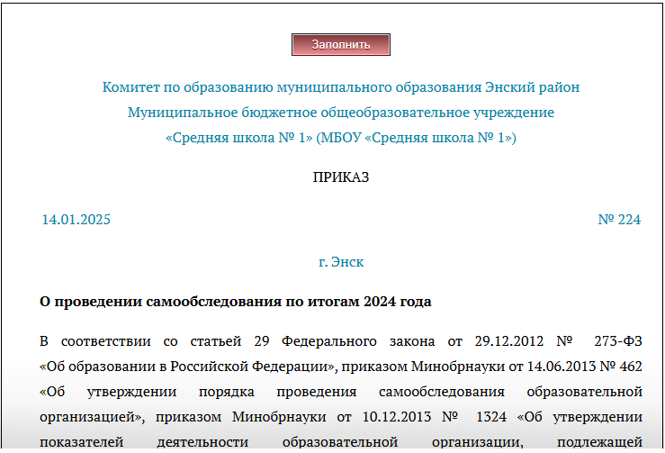 В соответствии со статьей 29 Федерального закона от 29.12.2012 № 273-ФЗ «Об образовании в Российской Федерации», приказом Минобрнауки от 14.06.2013 № 462 «Об утверждении порядка проведения самообследования образовательной организацией», приказом Минобрнауки от 10.12.2013 № 1324 «Об утверждении показателей деятельности образовательной организации, подлежащей самообследованию», в целях подготовки отчета о результатах самообследования и обеспечения доступности и открытости информации о деятельности МБОУ «Средняя школа № 1» за 2024 год