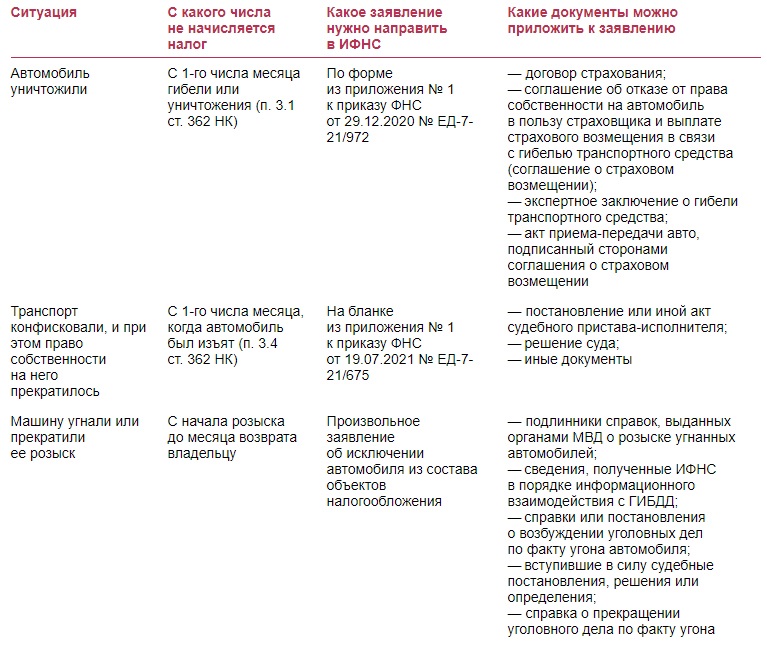 | Транспорт конфисковали, и при этом право собственности на него прекратилось | С 1-го числа месяца, когда автомобиль был изъят (п. 3.4 ст. 362 НК) | На бланке из приложения № 1 к приказу ФНС от 19.07.2021 № ЕД-7-21/675 | — постановление или иной акт судебного пристава-исполнителя; — решение суда; — иные документы |