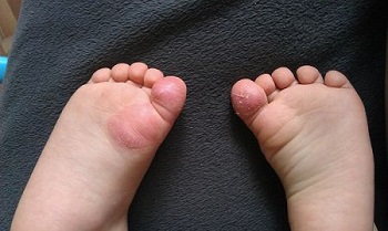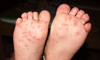 - Пузырьки в области сводов, по наружному и внутреннему краям стоп и в межпальцевых складках, которые вскрываются и образуются эрозии. Эрозии могут сливаться и образовывать очаги поражения с четкими границами, мокнутием.