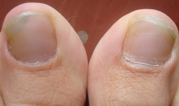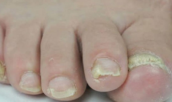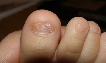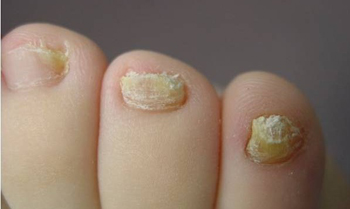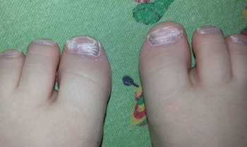 - Небольшие покраснение и шелушение на боковых соприкасающихся поверхностях пальцев или мацерация.