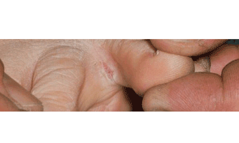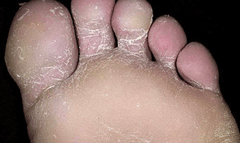 - В кожных бороздках отрубевидное шелушение, которое переходит на подошвенную поверхность пальцев. На подошвах может быть выраженное кольцевидное и пластинчатое шелушение.